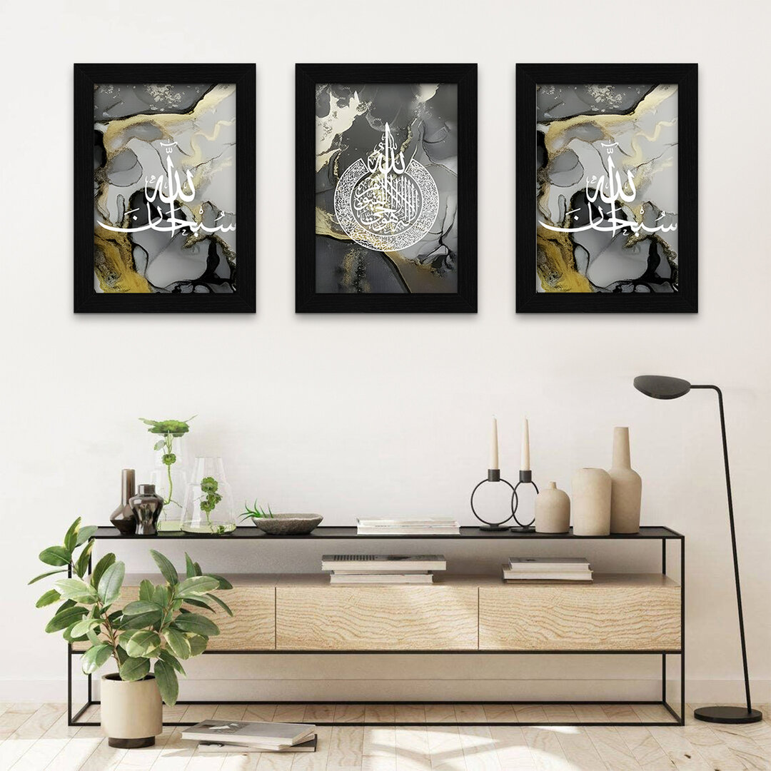 Ayatul Kursi Islamic Wall Art Set of 3 – Allah & Muhammad Name Calligraphy Grey Marble Prints with Frame