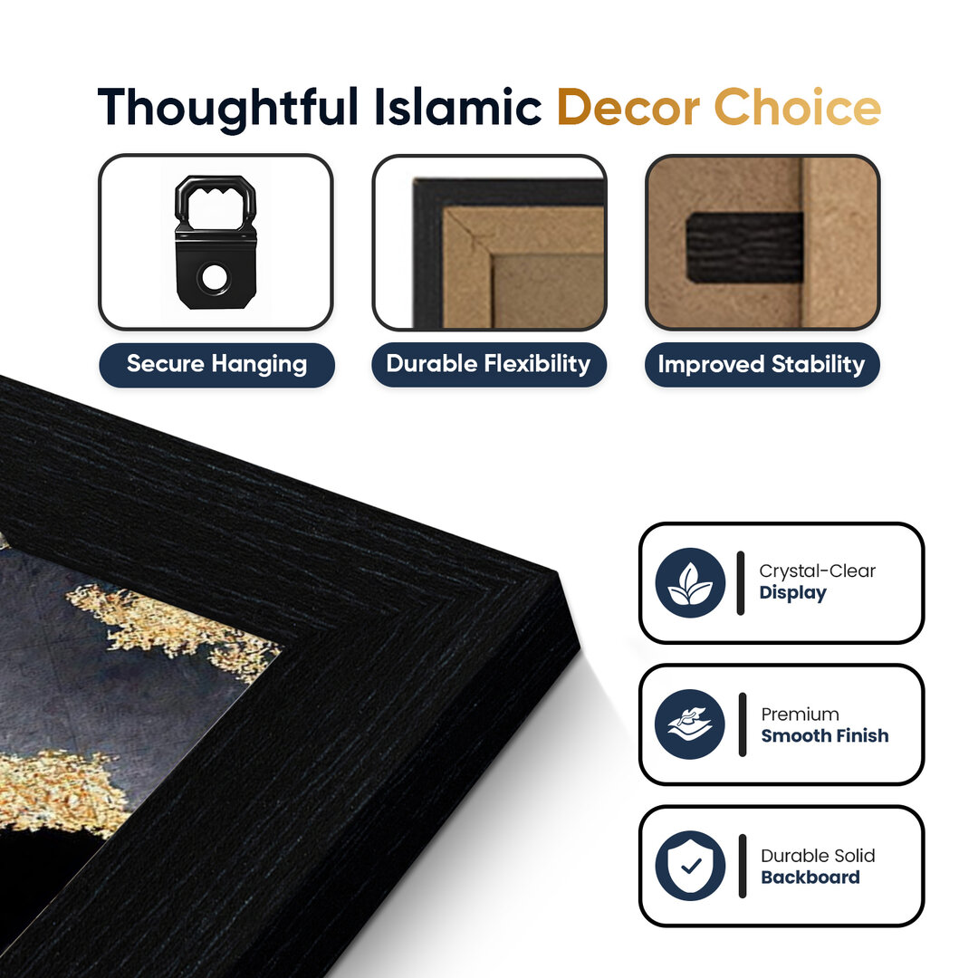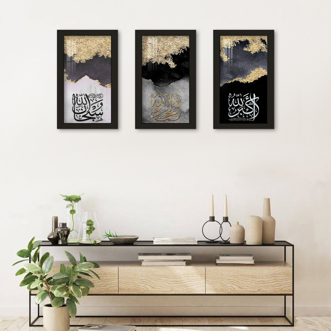 _x000D_This trio represents remembrance, gratitude, and devotion. The combination of grey and gold marble styling with black framing creates a bold yet refined look. It allows you to showcase meaningful Islamic phrases that complement your home décor while maintaining a strong visual presence.