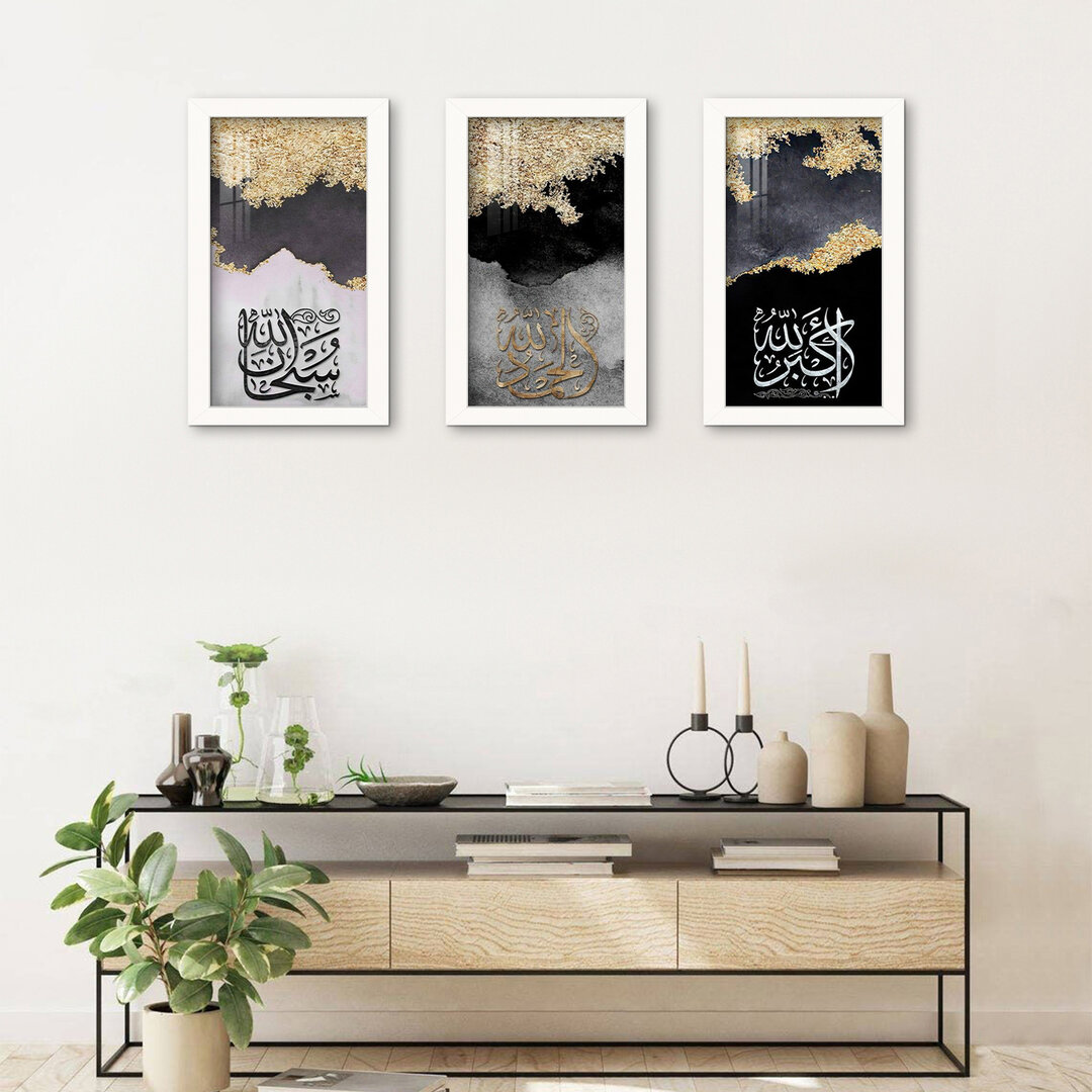 This trio represents remembrance, gratitude, and devotion. The combination of grey and gold marble styling with black framing creates a bold yet refined look. It allows you to showcase meaningful Islamic phrases that complement your home décor while maintaining a strong visual presence.