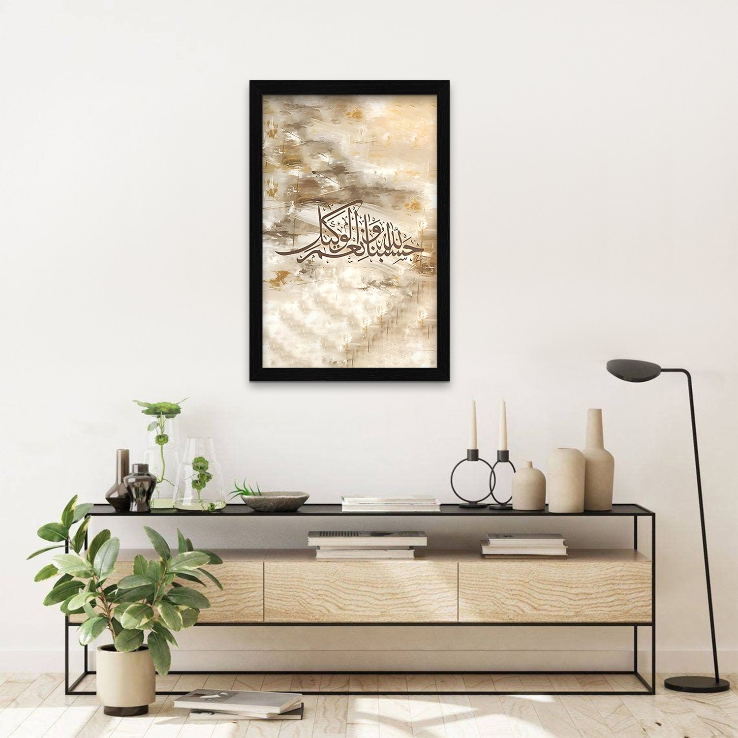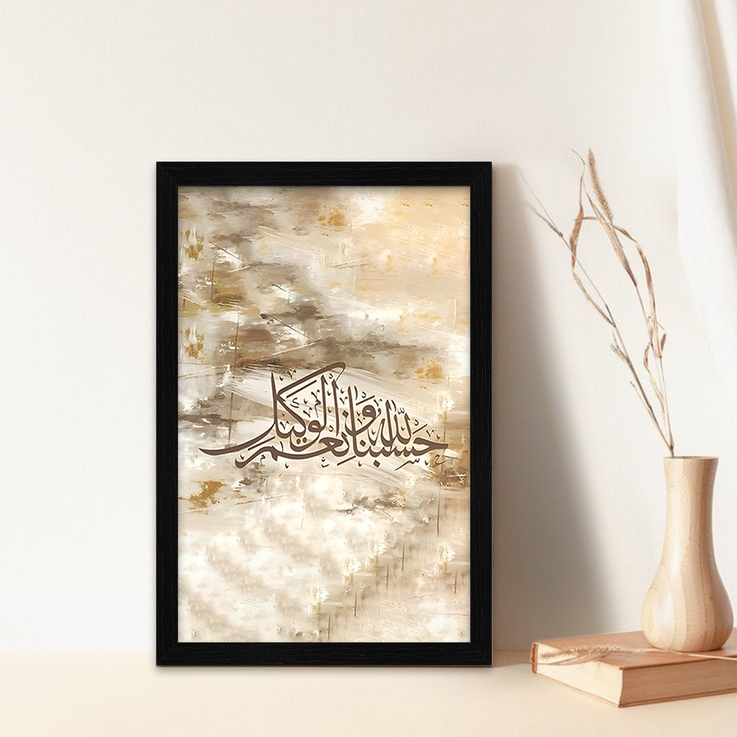 Bring faith and simplicity into your space with this Hasbunallah Wa Ni'mal Wakeel abstract Islamic art print. Designed with a contemporary aesthetic, this piece blends meaningful calligraphy with a clean, modern layout that complements both traditional and minimalist interiors. The black frame creates a bold contrast, allowing the artwork to stand out beautifully on any wall.