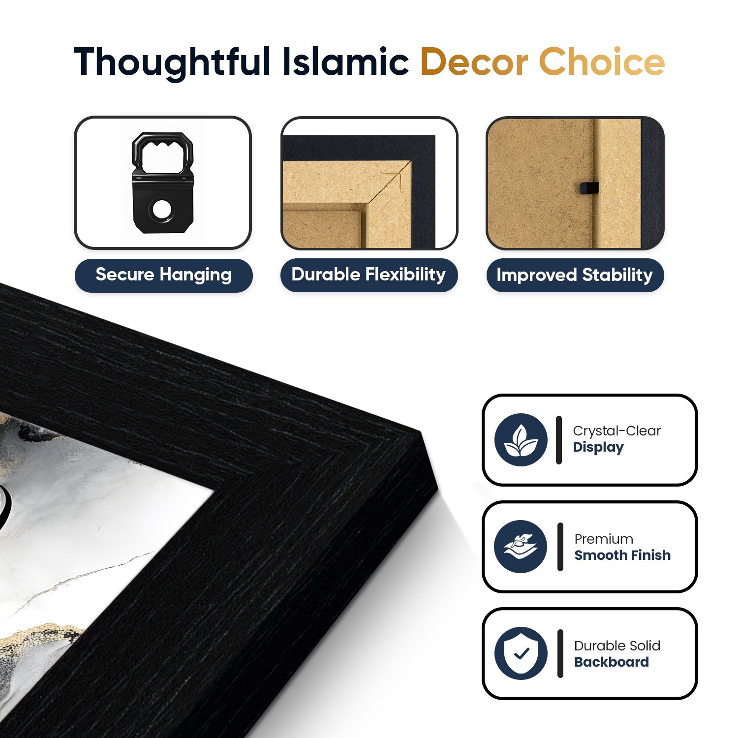 This framed set combines celebration and sophistication in one cohesive design. The monochrome marble finish ensures it complements a wide range of interior styles, while the meaningful Islamic phrases add warmth and spiritual significance to your home.